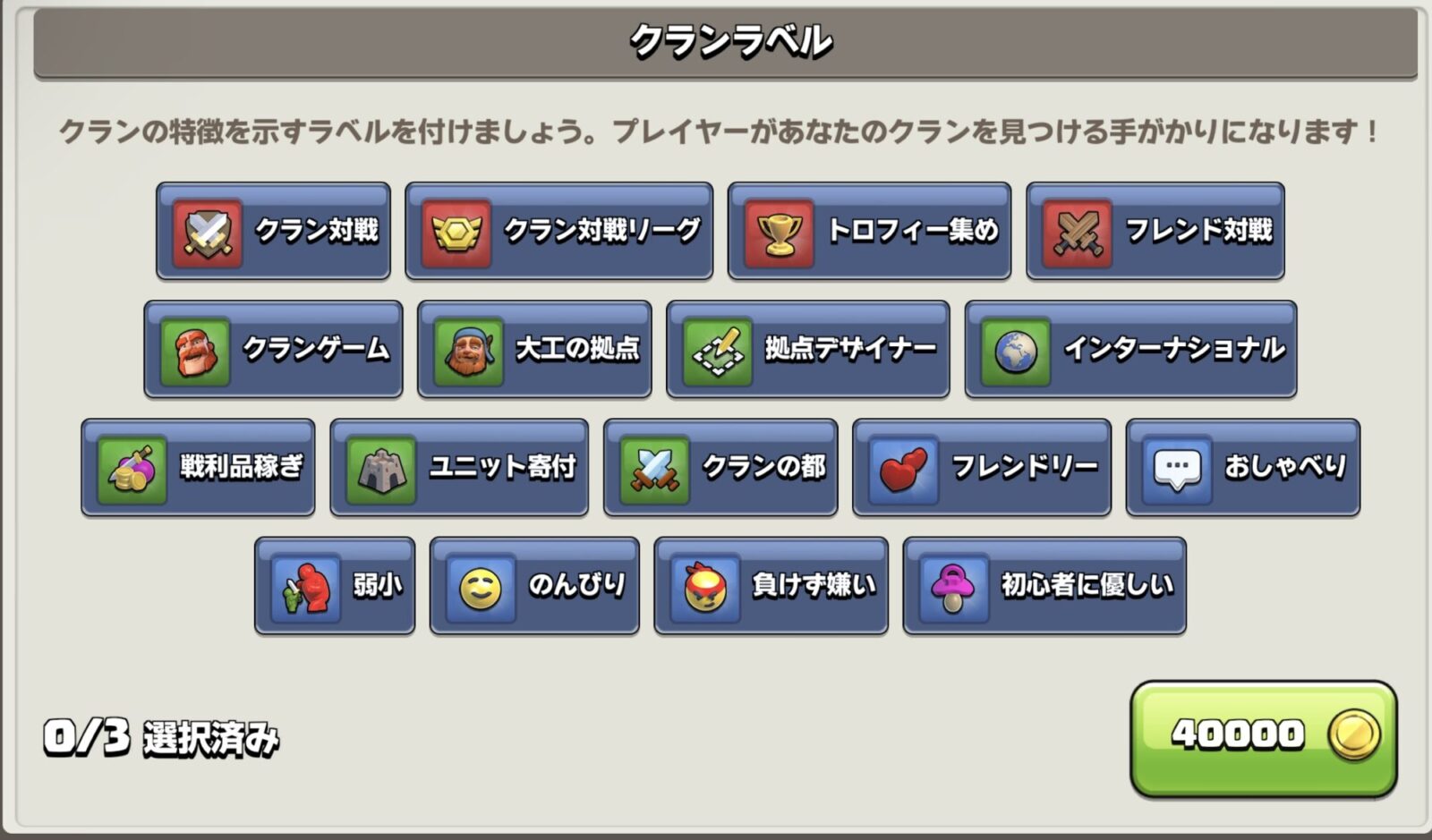 クランラベルの設定は、クラン検索で見つけてもらえるようにするための設定です。