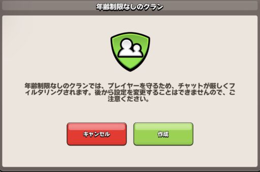 年齢制限のクラン設定は変更することができないため、何も考えずにチェックマークを付けないと加入できるアカウントが制限されます。