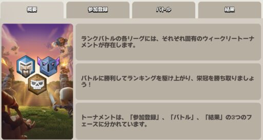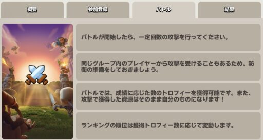 ランクバトルは、マルチプレイの2つのモードに分けられたうちの一つで、プレイヤー同士が実力を競い合う対戦システムです。プレイヤー同士が攻撃と防衛で獲得したトロフィー数を競い合い、上位のリーグへの昇格を目指して戦うことができます。