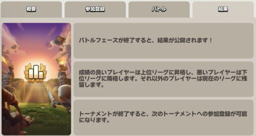 対戦期間(バトルフェーズ)が終了すると、結果が公開されます。昇格・残留・降格が決まり、対象のプレイヤーは別のリーグに移動するか残留します。
