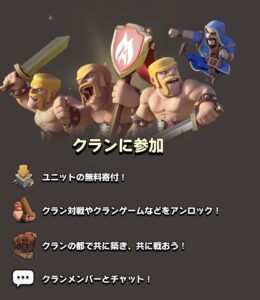 - 早めにクランに参加して、援軍やクラン限定コンテンツ、期間限定イベントに参加できるようにしておくと便利です。ただし、タウンホールのレベル8にしないと期間限定イベントに参加できません。