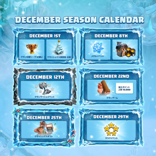 最大ポイントの上限が増えたクランゲームが開催されます。過去のイベントと同じ仕様であれば、いつもよりもイベント報酬が多くなるはずです。イベントの達成条件も高くなっているため、クリスマスはクラクラで過ごす人も出てくるかもしれません。