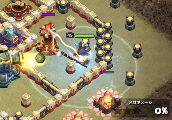 HPがある状態であれば、オーラが発生してダメージを与え続けることが可能です。壁以外の建物にダメージを与えることができる効果なので、防衛援軍やスケルトントラップの処理もできることが高く評価されています。