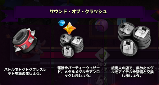 | 遊び方 | 指定された建物を破壊する 1. 攻撃して「トゲトゲブレスレット」を入手 2. 集めて「メタルメダル」を獲得 3. 旅商人のショップで報酬と交換 |