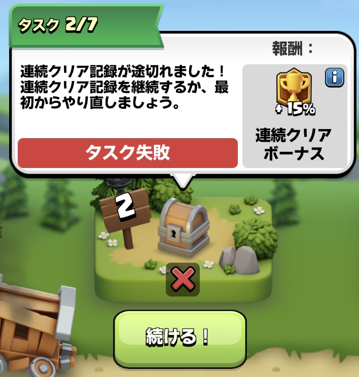 失敗したタイミングでタスク7の達成が難しくなることもあるため、最初からやり直すかエメラルドを使って続けるかのタイミングを知っておくと便利です。